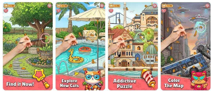 Agave Games 在“找猫”之后尝试了分类题材混休游戏,但都不成功(上图);目前正在测试「Find The Cat」的第二代产品(下图)| 图片来源:AppMagic