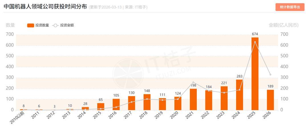 真正的拐点发生在2025年。全年投资数量跃升至674笔,投资金额亦同步冲至峰值,中国机器人产业的资本热度由此抵达前所未有的高点。