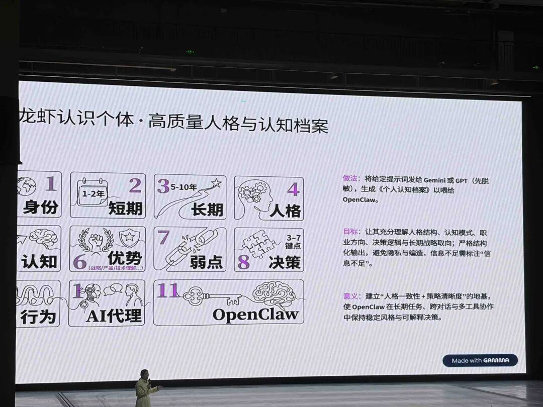 但她也认为,要想建立“人格一致性+策略清晰度”的地基,使OpenClaw在长期任务、跨对话与多工具协作中保持稳定风格与可解释决策,需要和AI之间建立5-10年的长期发展战略。不断地将给定提示词发给Gemini或GPT,生成《个人认知档案》以喂给OpenClaw。