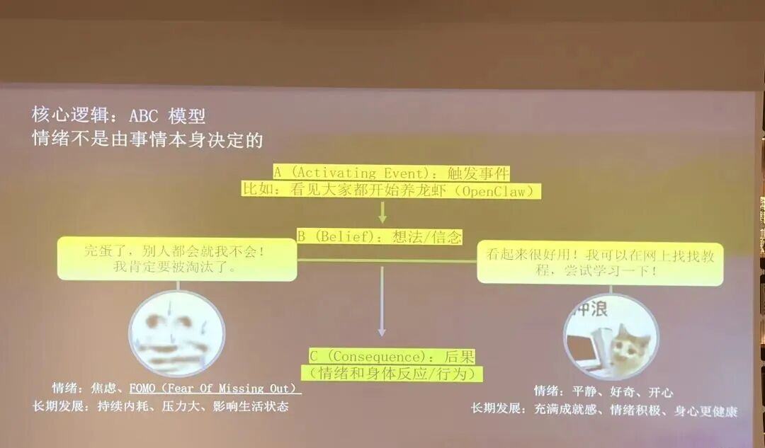 也有中国版“OpenClaw”开发者向霞光社表示,自开年以来,深圳几乎每天都会有“小龙虾”的沙龙。这种全民焦虑的源头,更与情绪相关。大湾区第一社群追光群在最新一期心理学社群分享上,也通过CBT疗法拆解了“龙虾焦虑”,即看见大家都开始养龙虾,产生了焦虑的情绪,而这会直接影响人的行为。