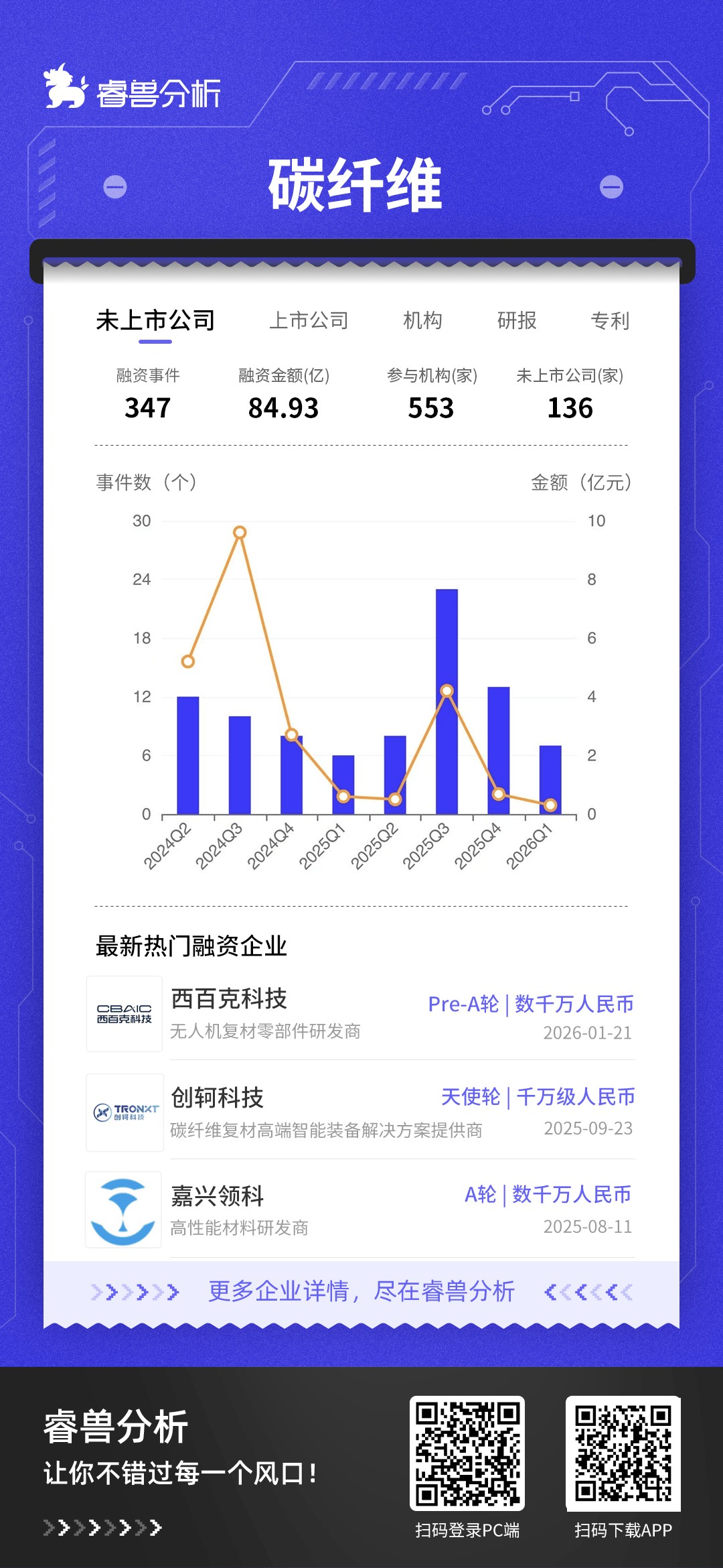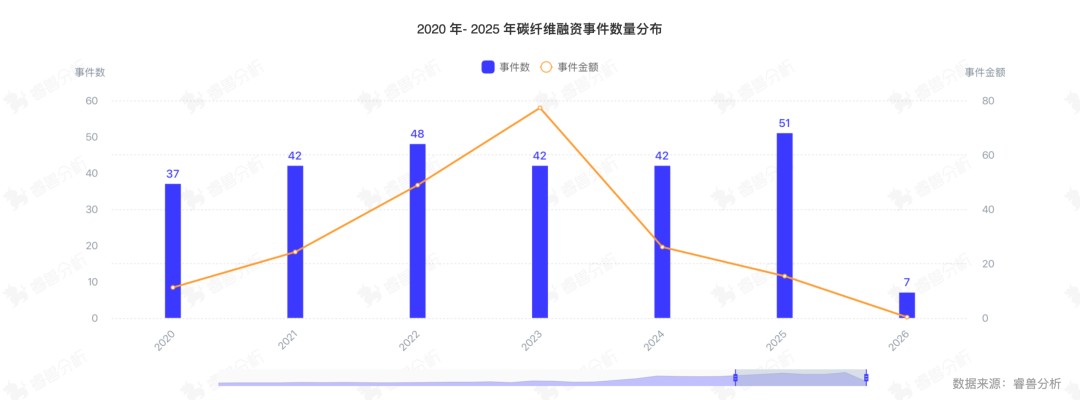 睿兽分析整理相关公司近年的融资情况,2020年至2025年碳纤维赛道的融资事件数量整体呈波动上升态势,具体表现为:融资事件数从2020年的37起,稳步增长至2022年的48起;随后在2023-2024年稳定在42起;至2025年,事件数量显著攀升至51起的峰值。或表明碳纤维赛道持续受到资本市场的高度关注,尤其是在新能源(风电、氢能)、航空航天等高景气下游应用的强力拉动下,资本持续加码布局从原丝、碳化到复合材料应用的完整产业链。