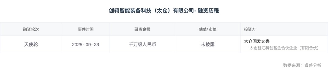 2025年11月,创轲智能完成首轮数千万级别融资,由太仓国发文鑫独家投资。