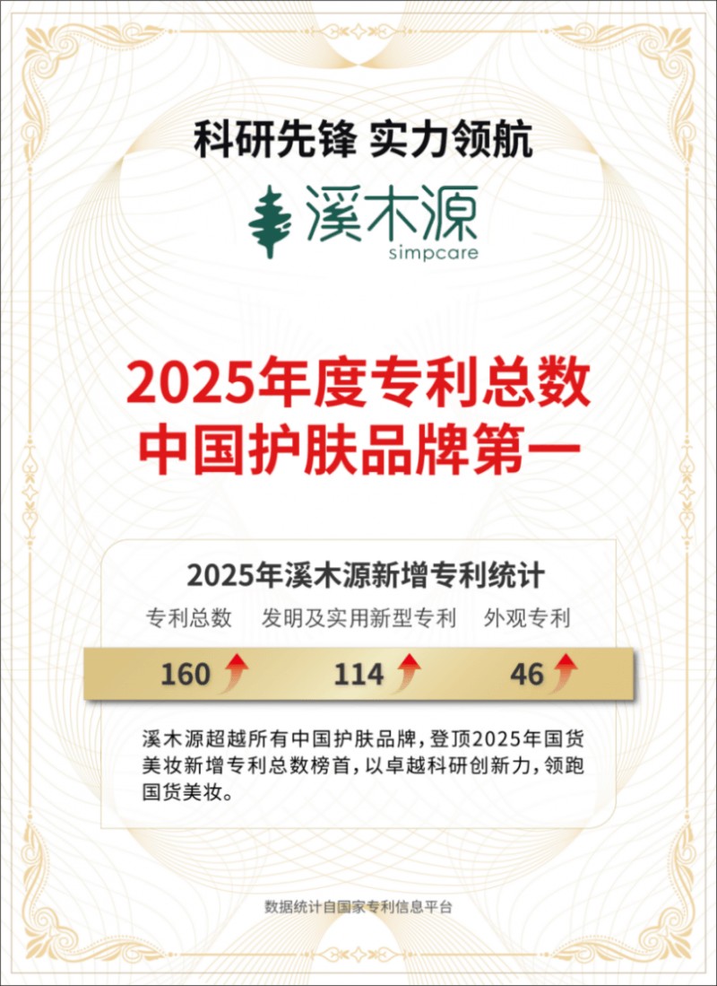 亮眼的市场表现和产品口碑的背后是溪木源对科研创新的极致追求,亦是始终贯彻“从科研到临床”的研发方针,打造医研共创的全链路敏感肌专研体系的有力体现。在CiE展会现场的「敏肌课堂」——敏感肌护理的创新突破与科学实证的分享中,溪木源研发合伙人、研发总经理张建华亮出了品牌最新的科研成绩单——截至2026年2月底,溪木源已累计获得477项专利授权及申请,发表核心学术论文60篇,主导及参与制定37项国家、行业、团体标准,涵盖中国首个敏感肌团体标准,推动行业向规范化和专业化发展。据国家专利信息平台统计,2025年溪木源新增专利总数达160项,位居中国护肤品牌第一,彰显绝对的研发创新能力。在此次展会上,溪木源荣膺2026CiE创新美妆大赏《年度最具创新力护肤品牌》奖项,其创新实力再次获得行业认可。