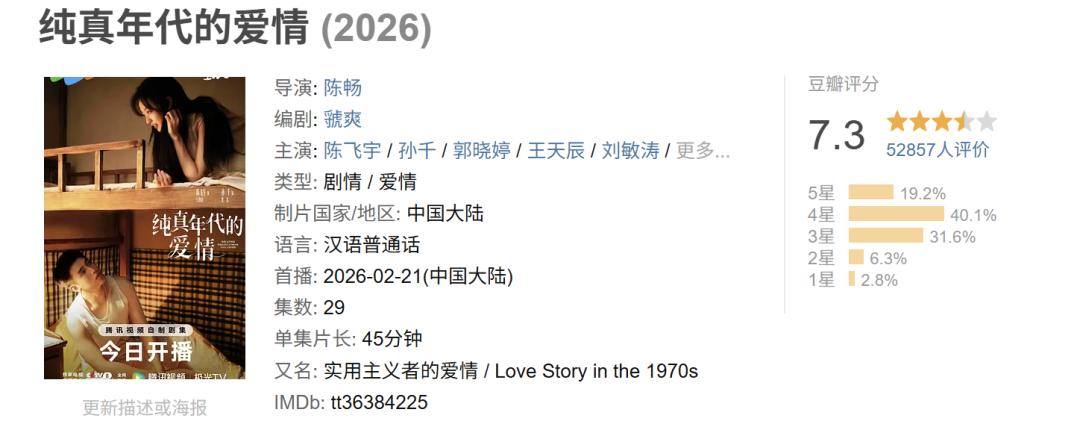 然而必须承认的是,这一波类型合流的尝试所取得的效果还远未到丰收的程度,至少从市场表现来看总体并不尽如人意。论热度,以上所提及的六部年代剧大都只能够上普通热播标准;论口碑,就豆瓣评分来说,已出分的几部剧集中,分数最高的《纯真年代的爱情》也仅拿到7.3分的中等成绩,而其他剧评分均未过7分。
