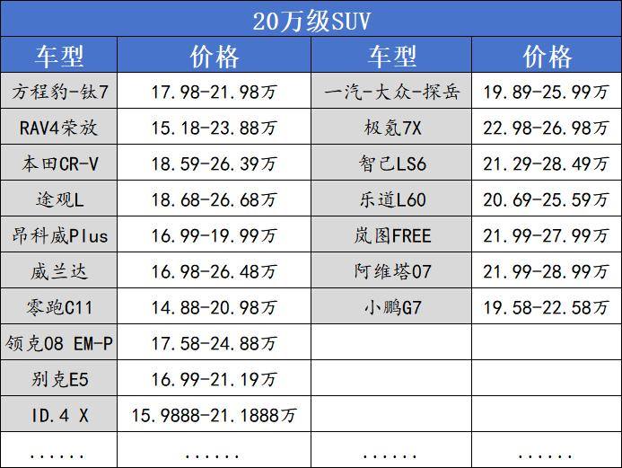 也就是说,当前20万元级SUV的潜在用户,他们对比续航、能耗、智驾能力、空间、保值率等多维指标,形成了既要又要的严苛标准。家庭用户尤其看重综合使用成本与配置实用性,这解释了为何合资油车车型与高性价比国产车能够快速崛起。