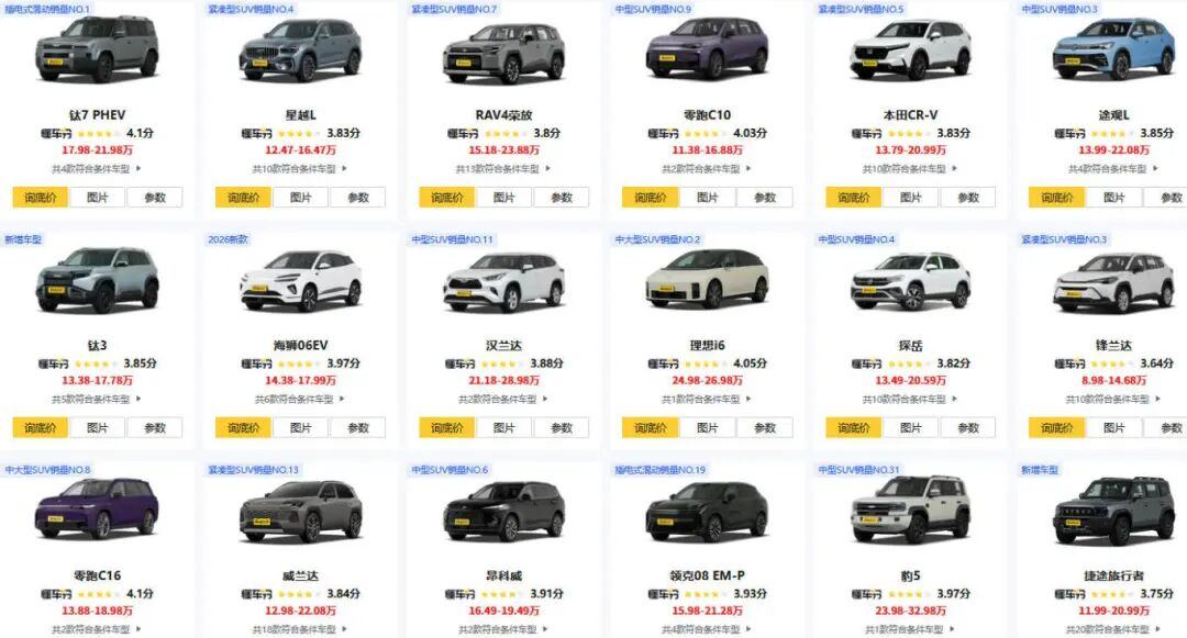 传统燃油车依然占据着销量基盘的位置,以大众探岳、途观L,丰田RAV4荣放、威兰达,本田CR-V,别克昂科威Plus等为代表的合资燃油SUV,虽然面临新能源浪潮的冲击,但凭借长期积累的渠道网络、用户口碑与保值率优势,在15-20万元区间仍保有可观的月销量。