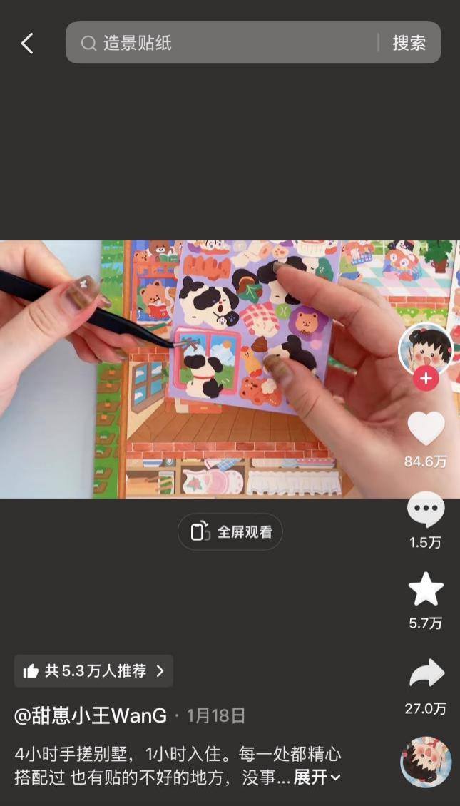 社交媒体上,自称是“助眠、解压博主”的“甜崽小王”在今年1月发布了一条沉浸式“手搓贴纸”(指自己凭想象力将单个贴纸组合成画)的视频,收获了近90万的赞,评论区里更是写满了路人对博主的崇拜。屏幕外,大家惊叹于她对于美的想象和创造力,更看到了这个全新的手工领域。