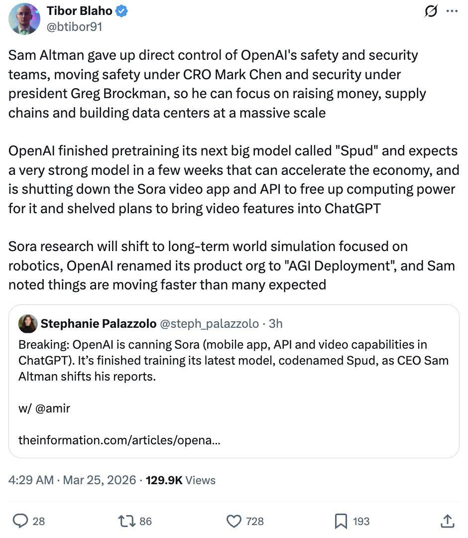 OpenAI已完成其下一代大型模型“Spud”的预训练,预计在几周内推出一款性能很强的模型。正是为了为这款新模型腾出算力资源,OpenAI决定关停Sora,同时搁置将视频功能接入ChatGPT的相关计划。