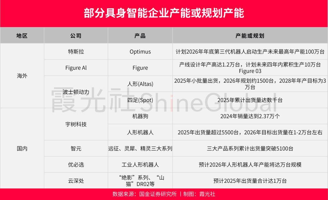国内方面,智元机器人计划2026年实现1万台产能,若交付顺利,营收有望实现翻倍增长;优必选人形机器人2025年全年订单总额已近14亿元,2026年产能将达到万台规模;云深处科技预计2025年机器人出货量将突破万台级,2026年将进一步提高产能。