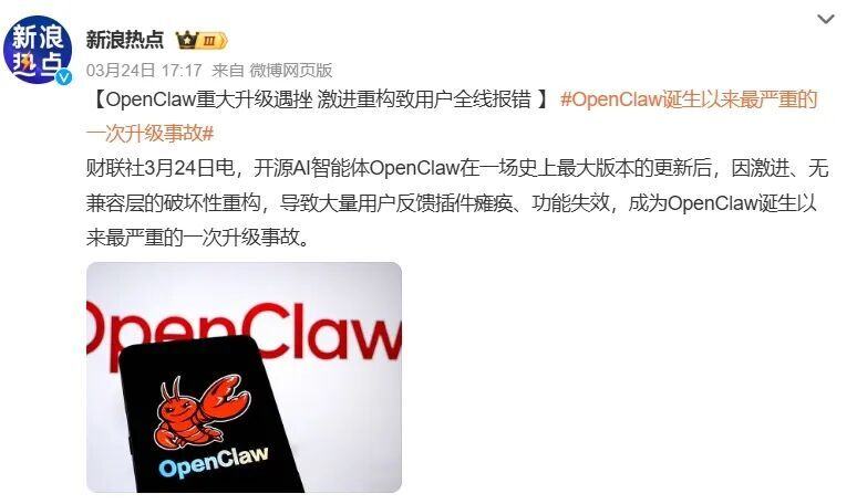 3月24日,Openclaw在一场史上最大版本的更新后,因激进、无兼容层的破坏性重构,导致大量用户反馈插件瘫痪、功能失效。一位资深科技从业者直言,向缺乏计算机安全基本知识的公众推广Openclaw安装,导致密码泄露、账户被盗等情况,是极其不负责任的行为;如果不做好环境隔离,不宜在日常办公电脑上“养龙虾”。