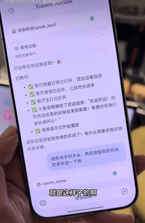 有用户体验Xiaomi miclaw发现,比起之前要对小爱同学说出开灯、播放音乐的具体指令,可以直接对其“表达意图”,Xiaomi miclaw便会根据用户意图控制米家家居做出反应。