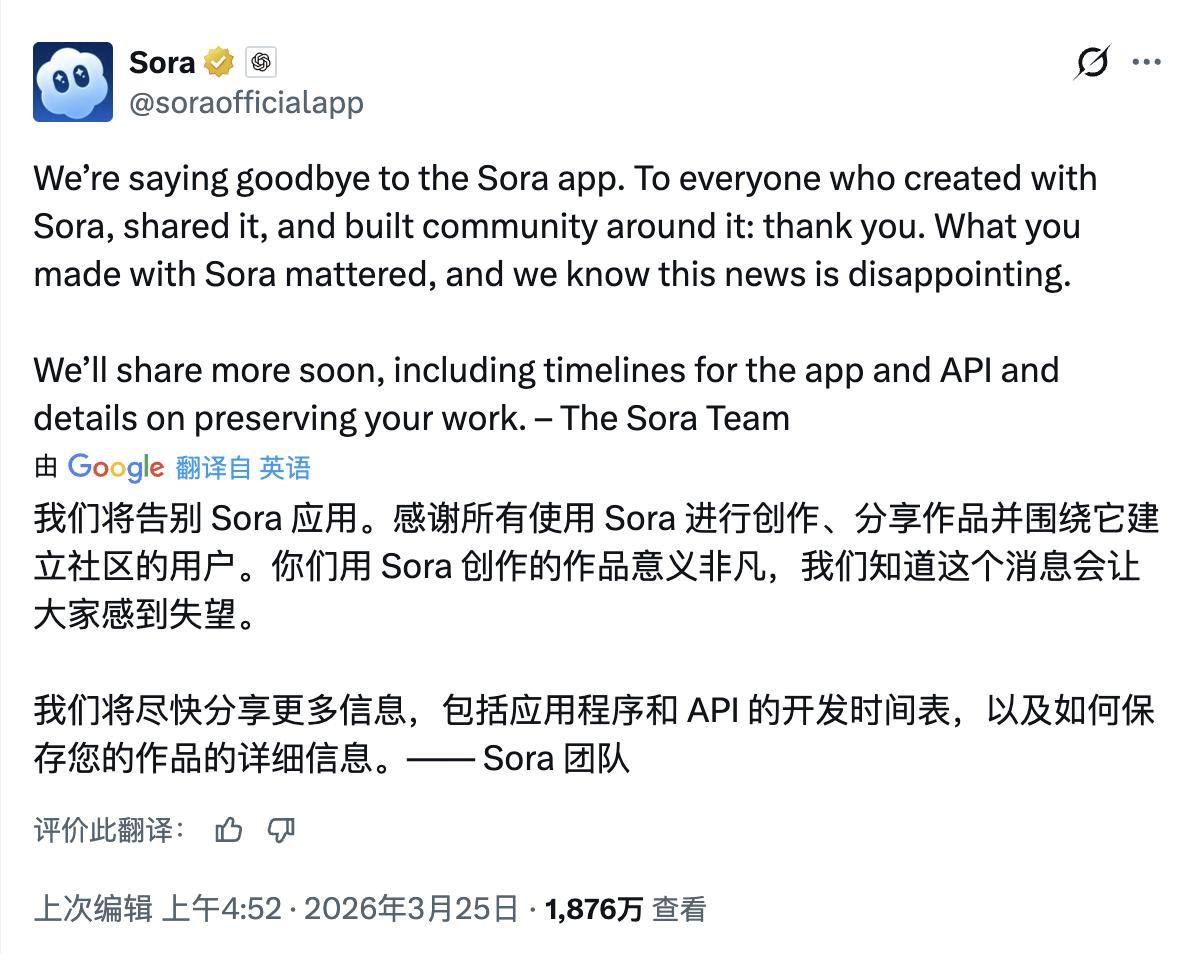 就在今天(3 月 25 日),OpenAI 做了一个颇为突然的决定:关停 Sora。