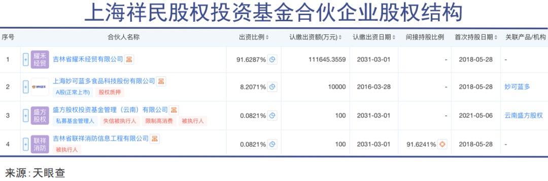 2018年6月,正值妙可蓝多高速扩张期,在擅长资本运作的柴琇主导下,妙可蓝多出资1亿元参股上海祥民投资基金,其合伙人包括吉林耀禾(由柴琇、崔民东夫妇旗下广泽投资控制)、妙可蓝多等四方。