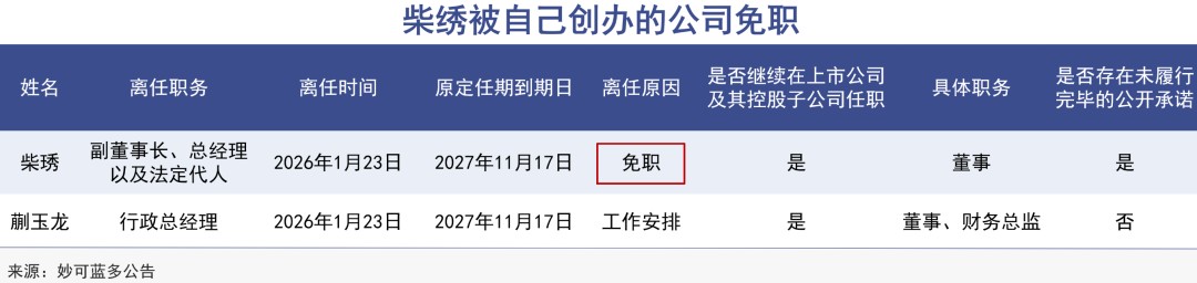 去年年底开始,妙可蓝多就发布一系列公告,开始和公司创始人柴绣进行“切割”。今年1月26日公司决定,免去柴绣的副董事长、总经理以及法定代表人职务,由原CFO蒯玉龙接棒。