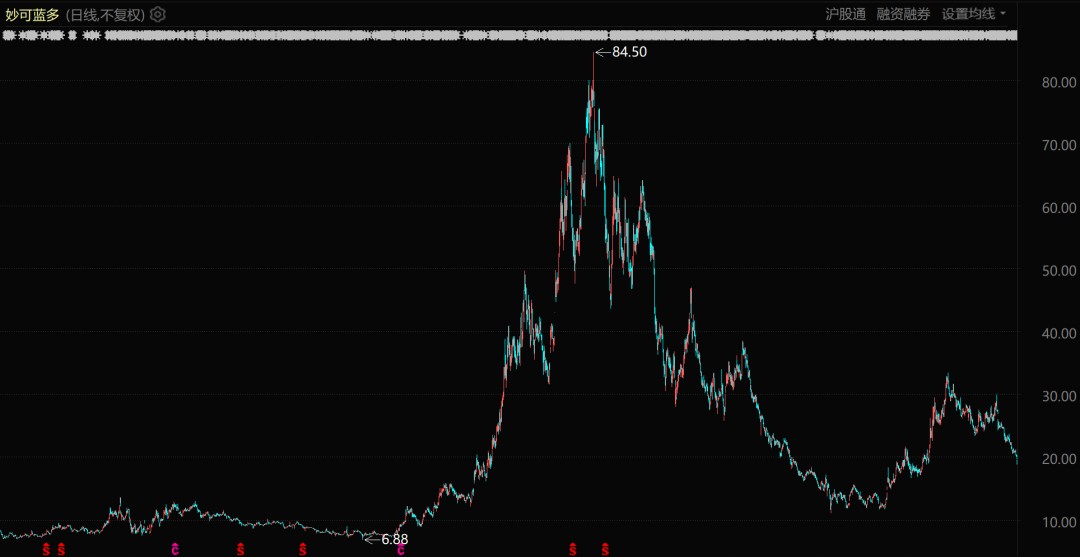此后,妙可蓝多股价如同坐上了火箭,区间涨幅高达十倍,成为新消费佼佼者。