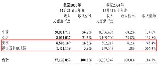 2025年,其海外收入达到162.7亿元,同比增长291.9%,占比从31.8%提升至43.8%。
