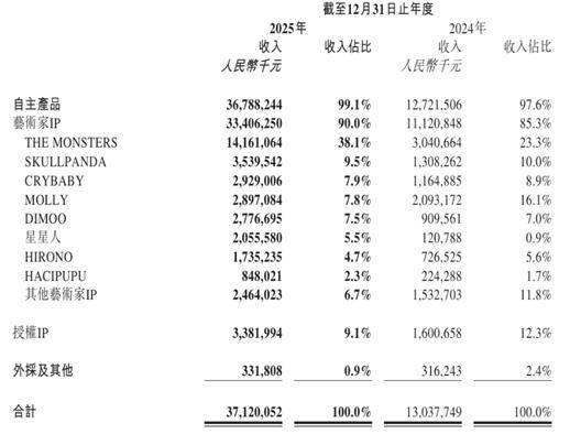 LABUBU贡献141.6亿元收入,依然是最耀眼的存在,但另一个不可忽视的变化是,艺术家IP收入占比提升至90%,授权IP收入同比增长111.3%。