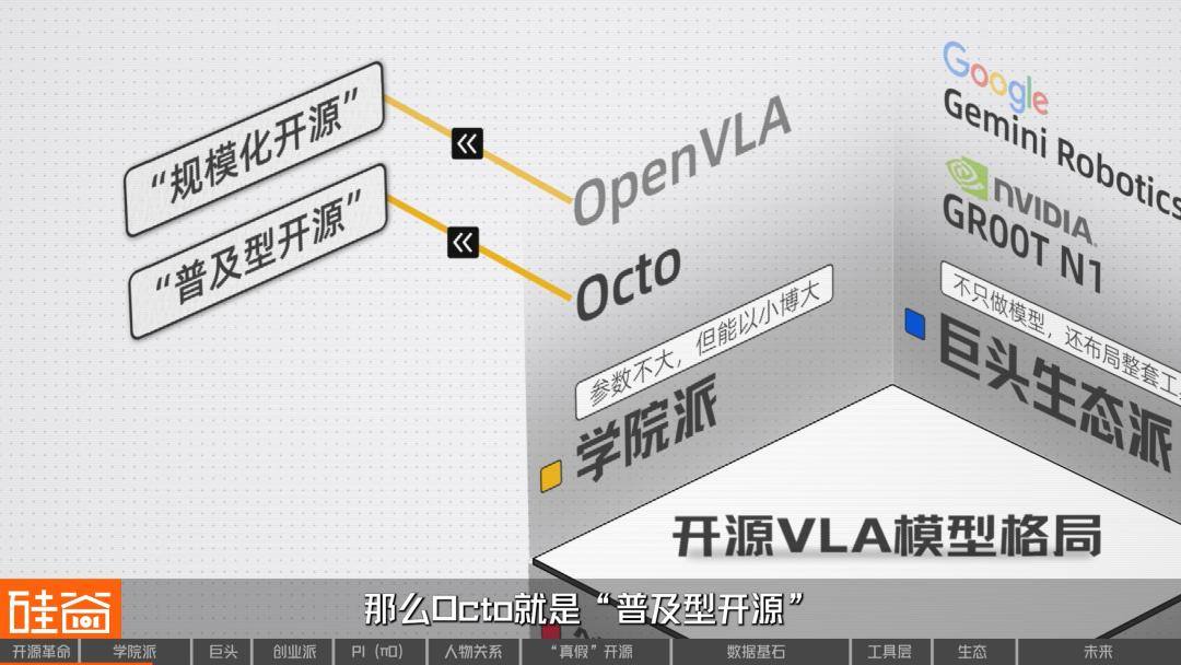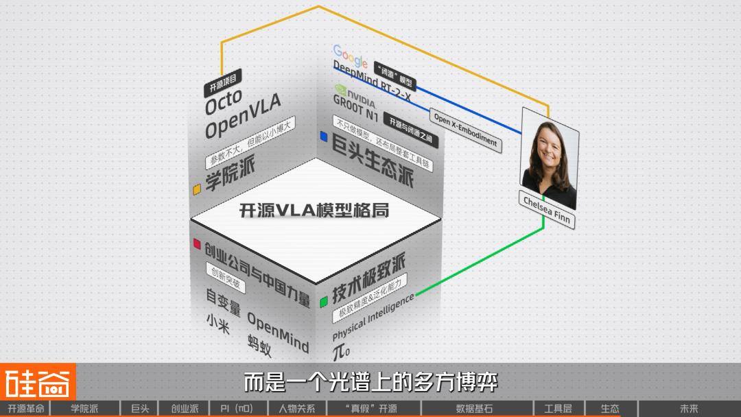 RT-2-X是谷歌的“闭源”模型,但它的训练数据有一部分来自Open X-Embodiment这个开源数据集。Chelsea Finn同时是Octo这个开源项目的核心作者,也是RT系列闭源工作的推动者,还是PI的联合创始人。而英伟达的GR00T N1介于开源和闭源之间。所以,这场竞争不是两个阵营的对决,而是一个光谱上的多方博弈。