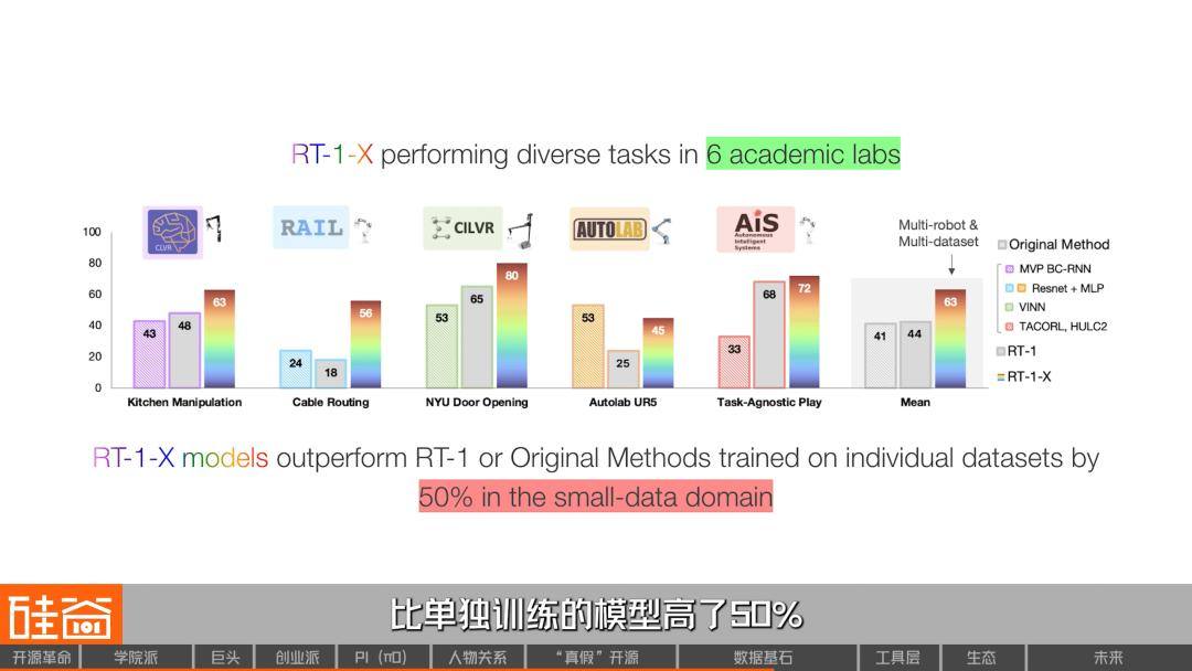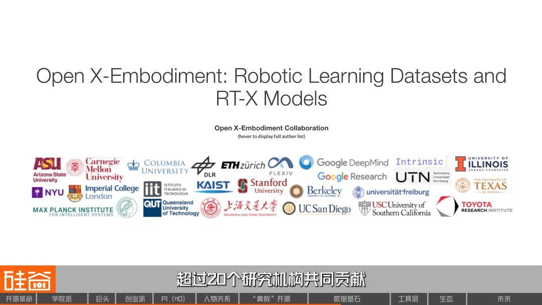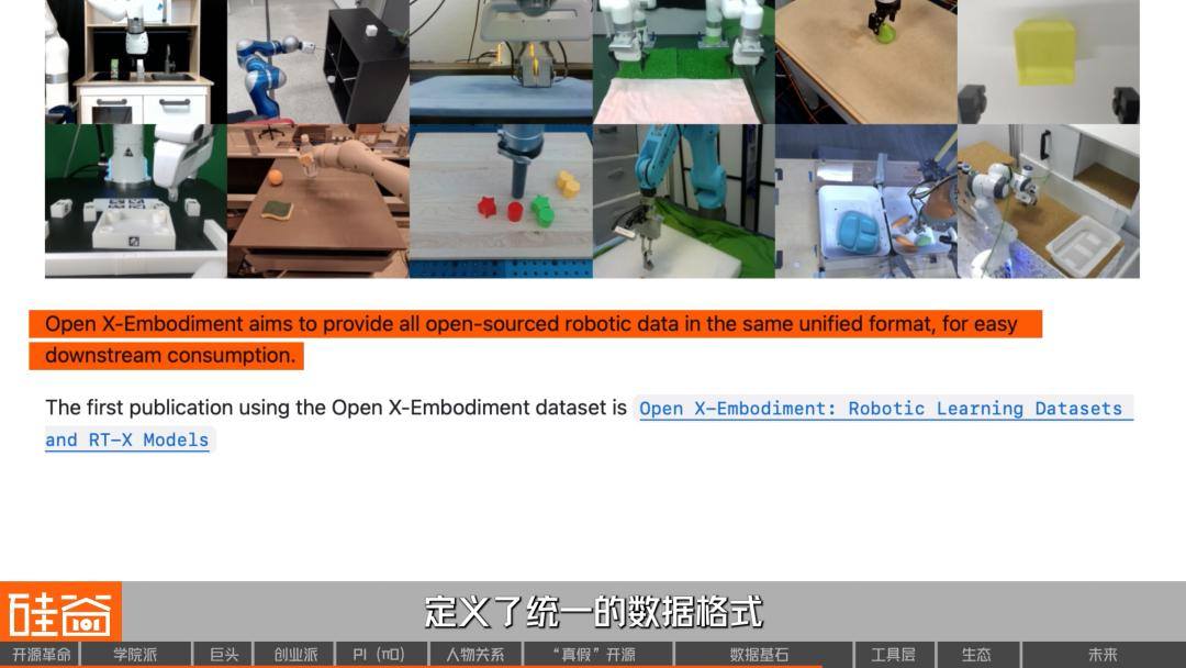 而Open X-Embodiment定义了统一的数据格式,涵盖视觉观察、本体感知、动作序列和语言注释,所以在产业中有了一个统一的标准,这个很重要。