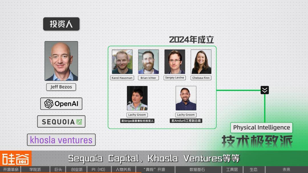 Physical Intelligence2024年成立,投资人包括Jeff Bezos、OpenAI、Sequoia Capital、Khosla Ventures。2024年11月融了4亿美元,2025年11月又融了6亿美元,估值达到56亿美元。