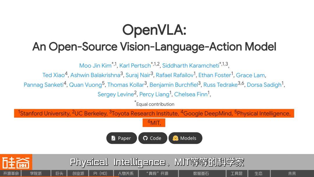 OpenVLA来自斯坦福和伯克利的联合团队,核心人物是这个领域的明星人物Chelsea Finn。