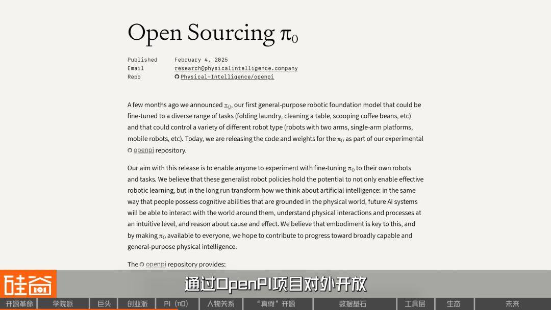同时,π₀的代码与权重通过OpenPI项目对外开放,使研究社区可以在它的基础上复现与扩展。这种做法在商业公司中并不常见,也成为开源阵营的重要力量。