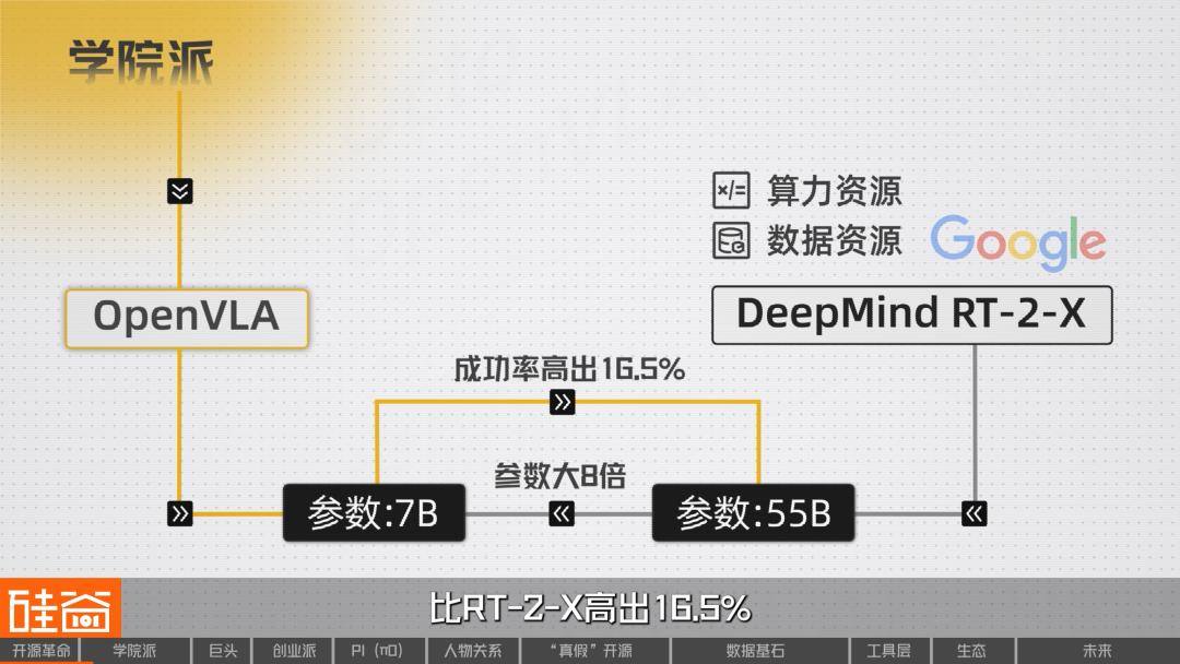 OpenVLA的一战成名,发生在2024年6月。这个只有70亿参数的开源模型,在29项机器人操作任务中,全面击败了“顶流”谷歌DeepMind的RT-2-X。RT-2-X有550亿参数,是OpenVLA的8倍大,背后站着整个谷歌的算力和数据资源。但结果是:OpenVLA的成功率比RT-2-X高出16.5%。