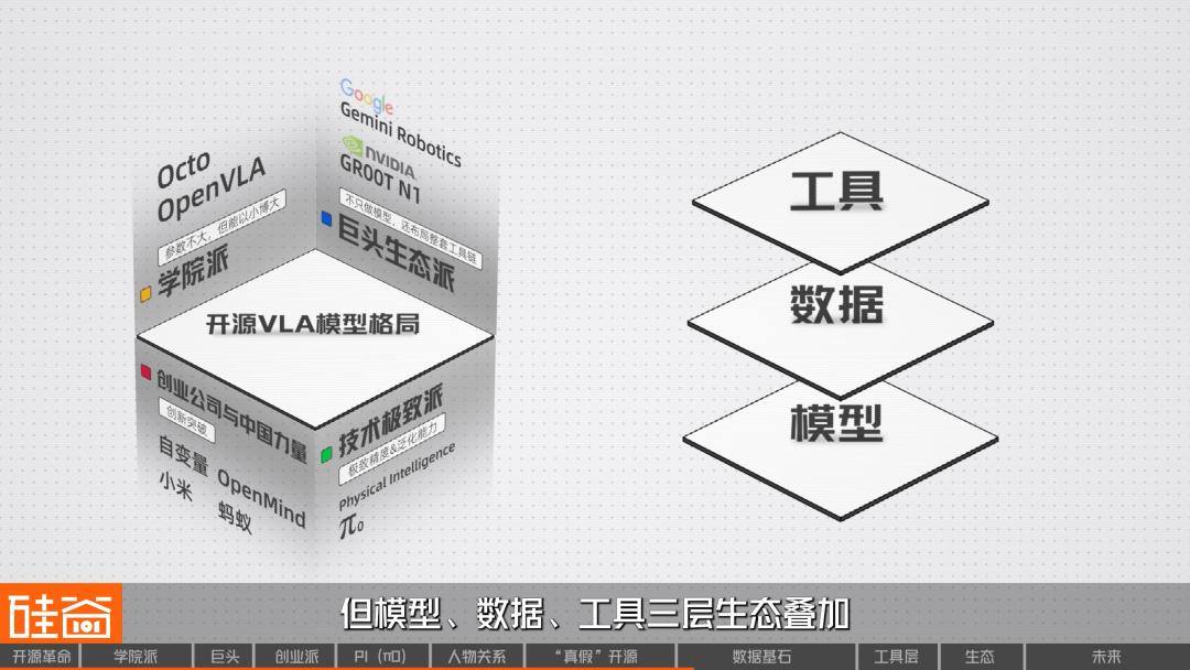 这里有一个很关键的观察:在大语言模型领域,开源是追赶者。OpenAI、Anthropic和Google先行,开源后追,晚一到两代。但在机器人领域,开源和闭源几乎是同时起跑的。