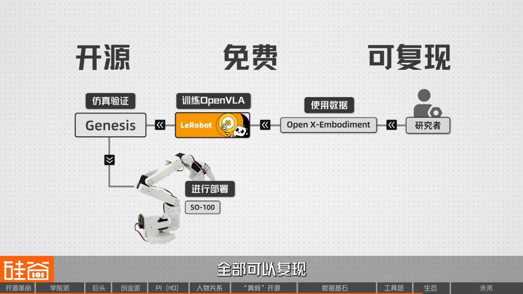 一个研究者可以用Open X-Embodiment的数据,在LeRobot框架上训练OpenVLA,用Genesis做仿真验证,然后部署到100美元的SO-100机械臂上。整个流程全部开源,全部免费,全部可复现。