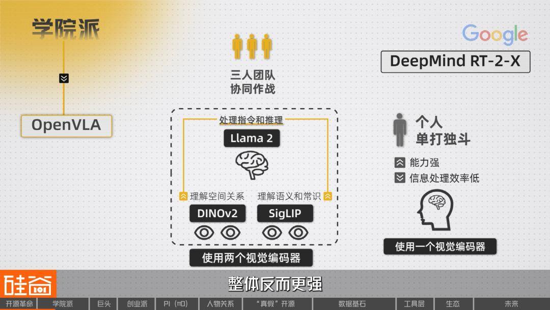 对比谷歌RT-2-X,因为它只用了一个视觉编码器,你可以想象成一个超聪明但什么都自己做的人:能力很强,但信息处理效率更低。
