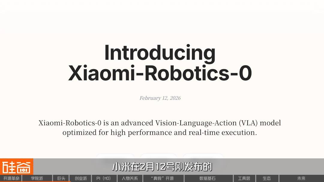小米在2月12号刚发布的Xiaomi-Robotics-0,47亿参数,用MoT混合架构——把“大脑”(视觉语言理解)和“小脑”(动作执行)分开,改善了VLA模型普遍存在的推理延迟问题。模型开源,在消费级GPU上就能跑。