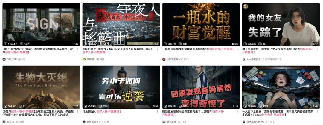 在这个维度上看,B站的优势最为直接,它本身就是一个以创作者为中心的UGC社区,AI创作大赛从1月5日启动以来,因为是创作者直接上传作品参赛,成果来得最快。目前B站AI内容日均投稿量同比增长83%,每月有超过8000万用户在平台观看AI相关内容。