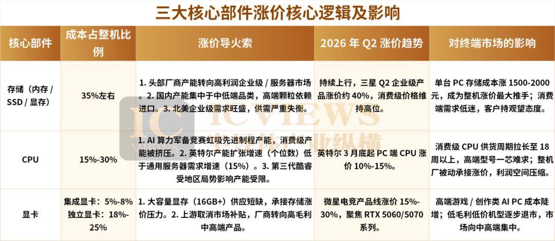 这一轮全品类涨价,根源就是PC核心零部件的集体提价,存储、CPU、显卡三大核心部件同步上涨,直接推高整机BOM成本,倒逼终端厂商被动调价自保。业内人士向半导体产业纵横记者坦言,眼下整机厂几乎没有定价话语权,只能被动承接上游芯片厂的涨价指令,自身的利润空间被不断挤压。
