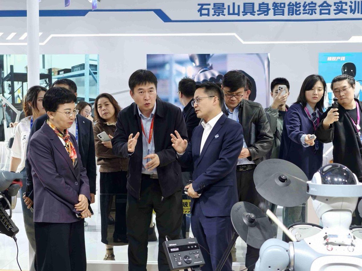 在论坛之外,机器人乐队作为灵宝CASBOT多机协同能力的重要呈现形式,也继续出现在更多公开活动现场。3月27日至29日,在2026北京国际科幻与未来产业博览会上,灵宝CASBOT机器人乐队再次亮相表演,吸引众多观众驻足围观。活动期间,石景山区委副书记万隆、区委常委李文化莅临灵宝CASBOT展位参观并指导工作。