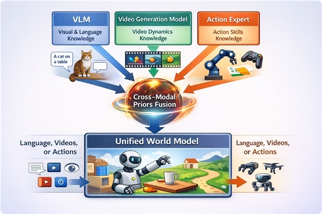 在模型架构上,Motus基于 UniDiffuser 统一建模框架,通过跨模态先验融合(Cross-modal Priors Fusion),将视觉语言知识(VLM)、视频动态知识(Video Generation Model)与动作技能知识(Action Expert)整合进同一模型,实现语言、视频与动作的统一表达与生成,构建真正意义上的统一世界模型。