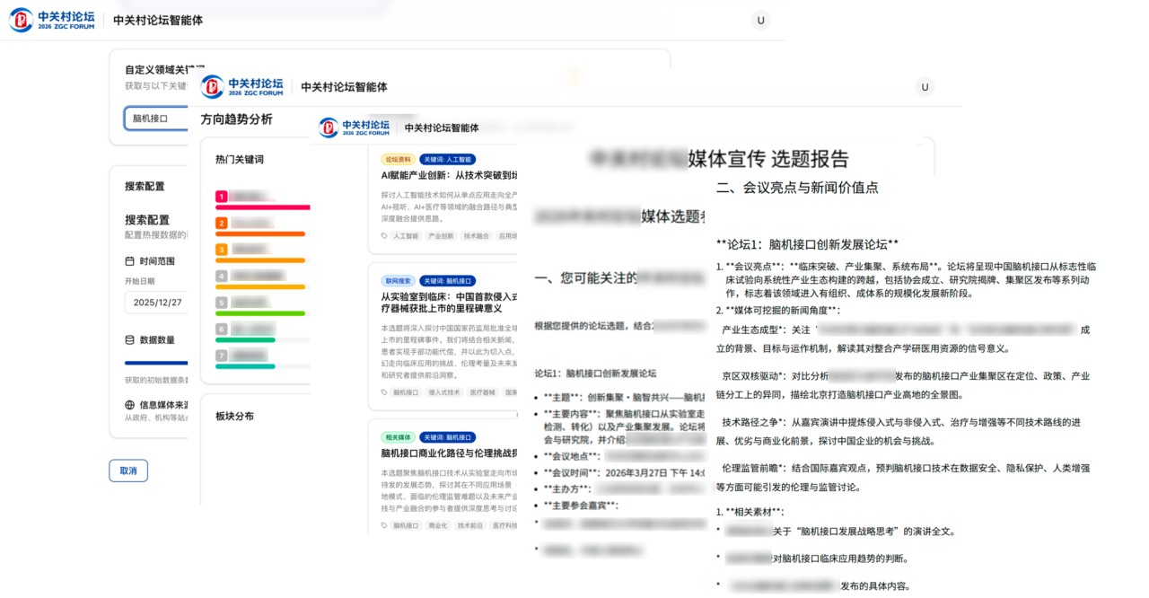 二是智能选题应用。针对论坛高规格会议密集、策划统筹工作量大的核心痛点,整合外部前沿方向、舆情热点动态与内部会议纪要、嘉宾资源等核心信息,精准捕捉行业动态,为论坛整体策划、媒体宣传素材筹备、稿件撰写等核心业务提供全链路支撑,提升会议策划的落地效率。
