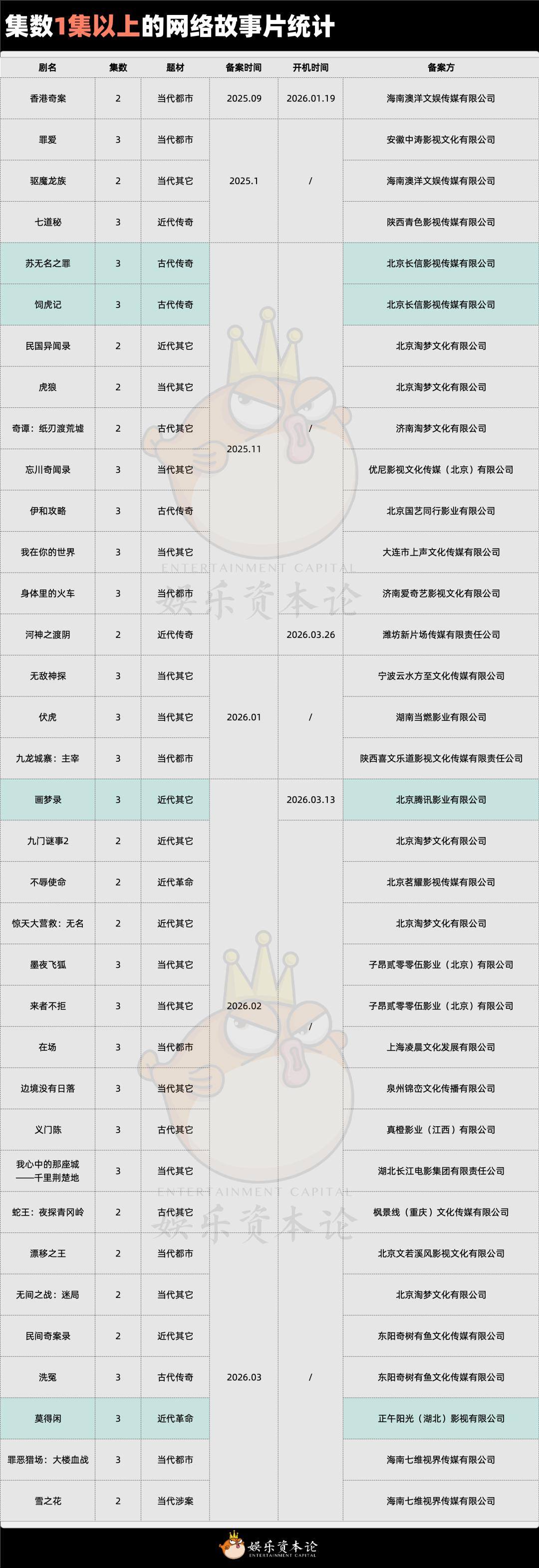 其二,是在已公示的6个月备案中,网络故事片大部分备案集数为“1集”,从剧名、题材到备案公司,都很像是网大内容的“平移”。如今已知开机的四部网络故事片中,除了《画梦录》之外,其余三部也都是悬疑、冒险这类网大主流的猎奇题材。