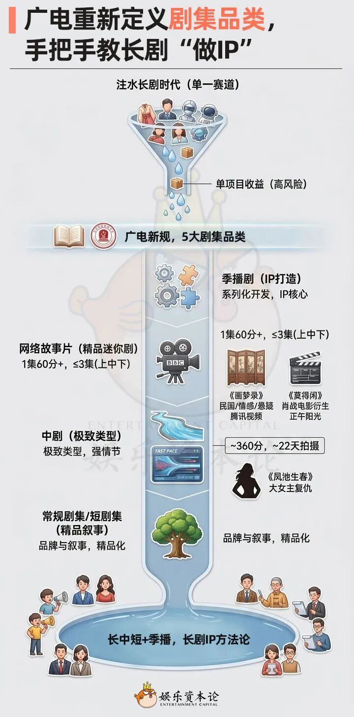 回到最初的那个命题,在短剧追求15秒一个爽点、AI开始批量生成‘电子榨菜’的今天,长剧的未来,绝不是去和短剧比谁更短、比谁更下沉。广电推行的新品类,表面上看是剥夺了长剧靠‘注水’赚快钱的温床,实际上却是逼迫行业向死而生。