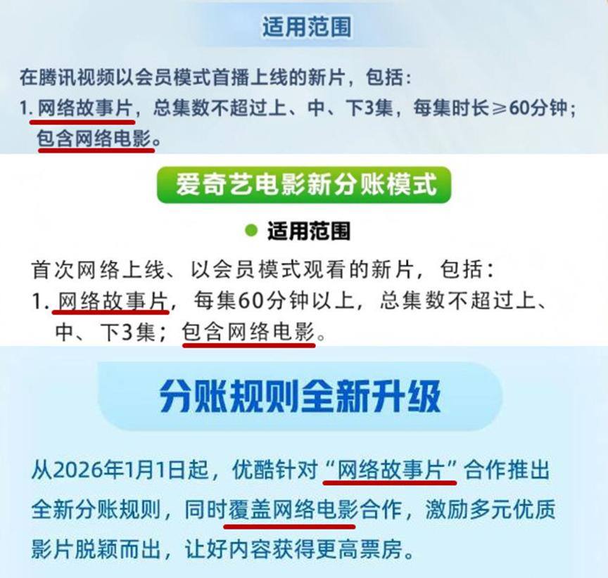 其一,是在今年年初爱腾优三大平台推出的分账新政策中,单独列出了网络故事片的分账规则,同时也明确将网络电影放在网络故事片的覆盖范围之下。