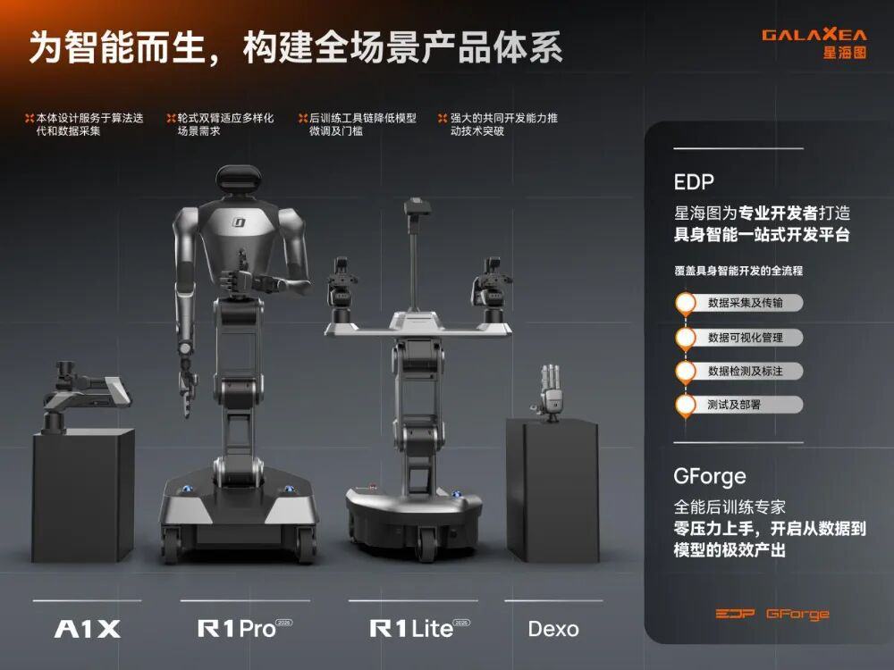 硬件之外,星海图自研的EDP具身智能开发平台实现了真实场景下从数据采集、标注到模型部署的全流程闭环。通过集成一站式后训练工具,EDP 与具身基础模型、机器人本体深度协同,大幅降低了研发门槛,为开发者提供了一条从原型验证到规模化部署的高效路径。