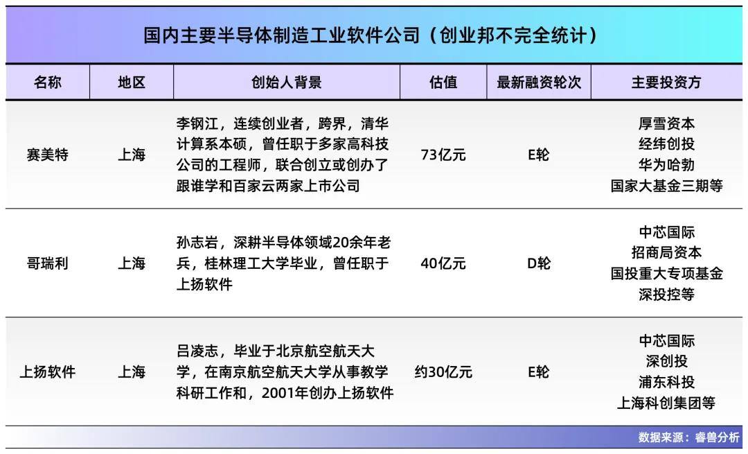 根据招股书,在中国半导体智能制造软件市场上,赛美特是收入最高的中国公司:2024年,按照收入排名:应用材料、西门子、赛美特、哥瑞利和上扬软件在该领域的营收分别为24亿元、7.5亿元、3.7亿元、1.2亿元和1亿元不到。