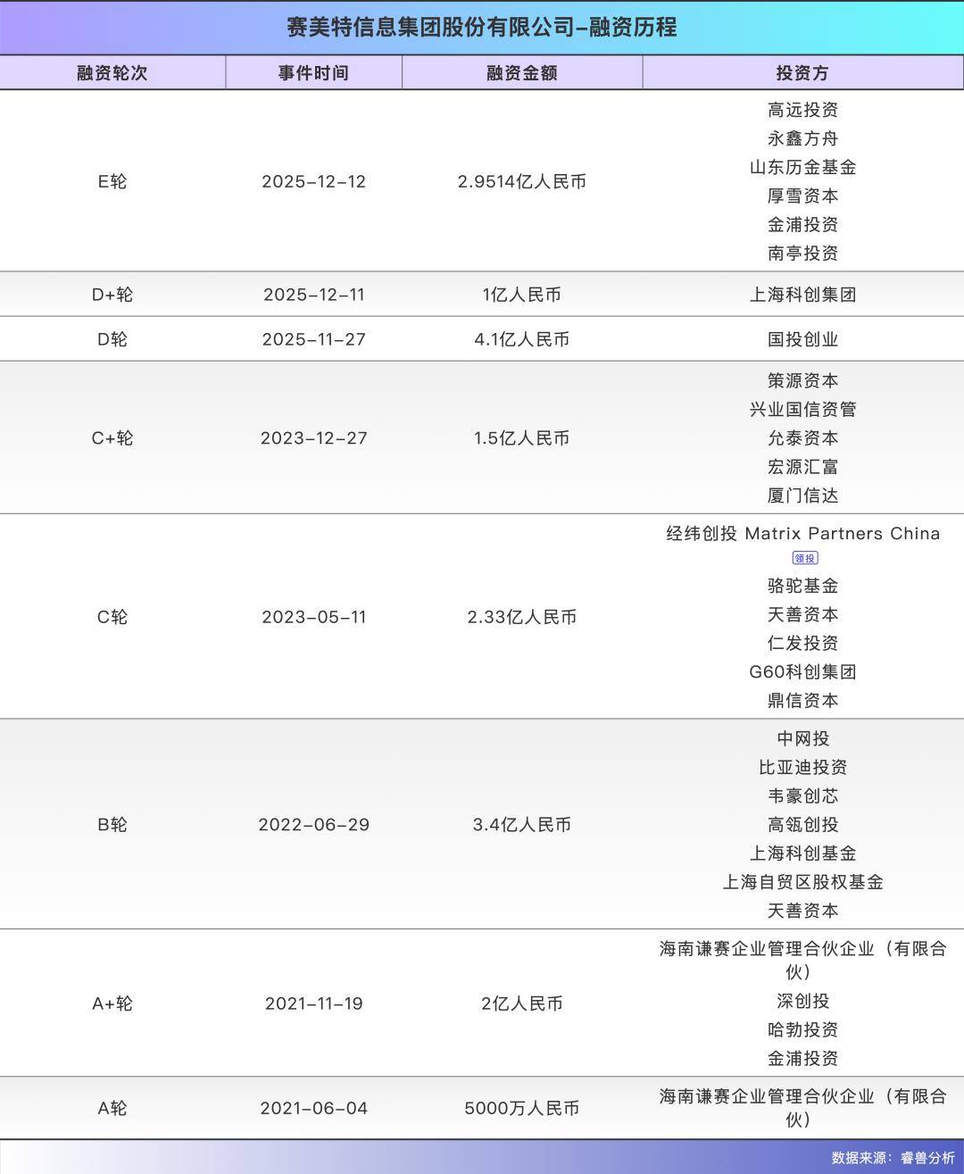 2021年,赛美特除了完成了A轮和A+轮融资,两轮融资金额合计约为2.5亿元,投资方包括厚雪资本、华为哈勃、深创投、金浦投资等。其中,A轮是赛美特首轮对外融资,投资方为厚雪资本,金额为5000万元,此后又在A+轮再投资2000万元,再于E轮投资2000万元。