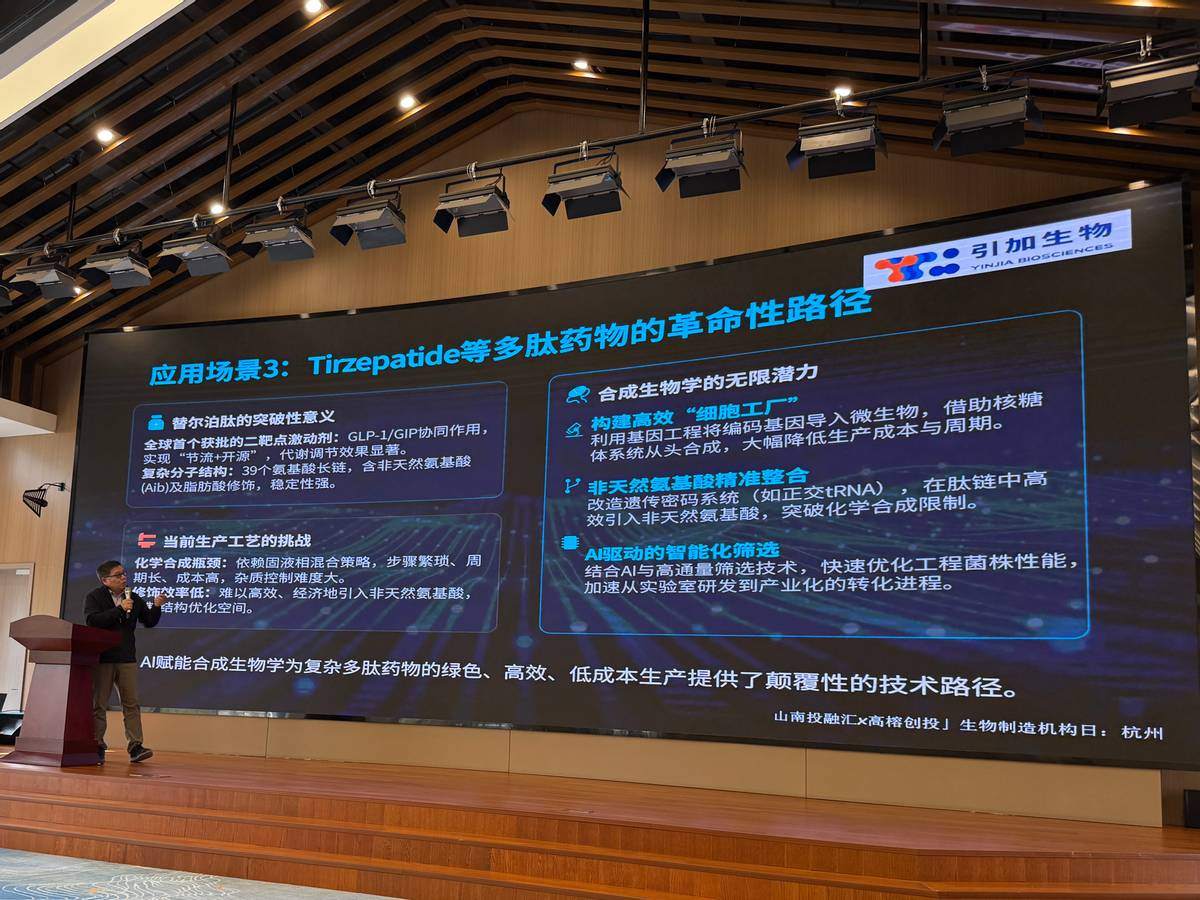 引加生物创始人兼CEO 吴一飞的分享围绕《基于第一性原理的技术攻坚和商业化挑战》展开。他认为,生物制造的本质是通过活体系统降低医药、材料、能源等领域成本,整体市场规模已超万亿,中国市场增速领跑全球。而在技术创新上,引加生物团队以第一性原理为指引,从生物体基本单元和核心限制机制出发,结合AI完成蛋白设计与验证,自主开发的无细胞蛋白表达体系已在微量<10 ul蛋白芯片中实现高效表达,大幅缩短AI设计和高通量实验验证闭环,赋能生物医药和其他领域的底层创新和成本需求。当前,行业的商业化进程仍面临成本、质量、法规准入与市场竞争等多重压力,可通过轻资产模式联合CRO/CDMO合作破解发展难题。