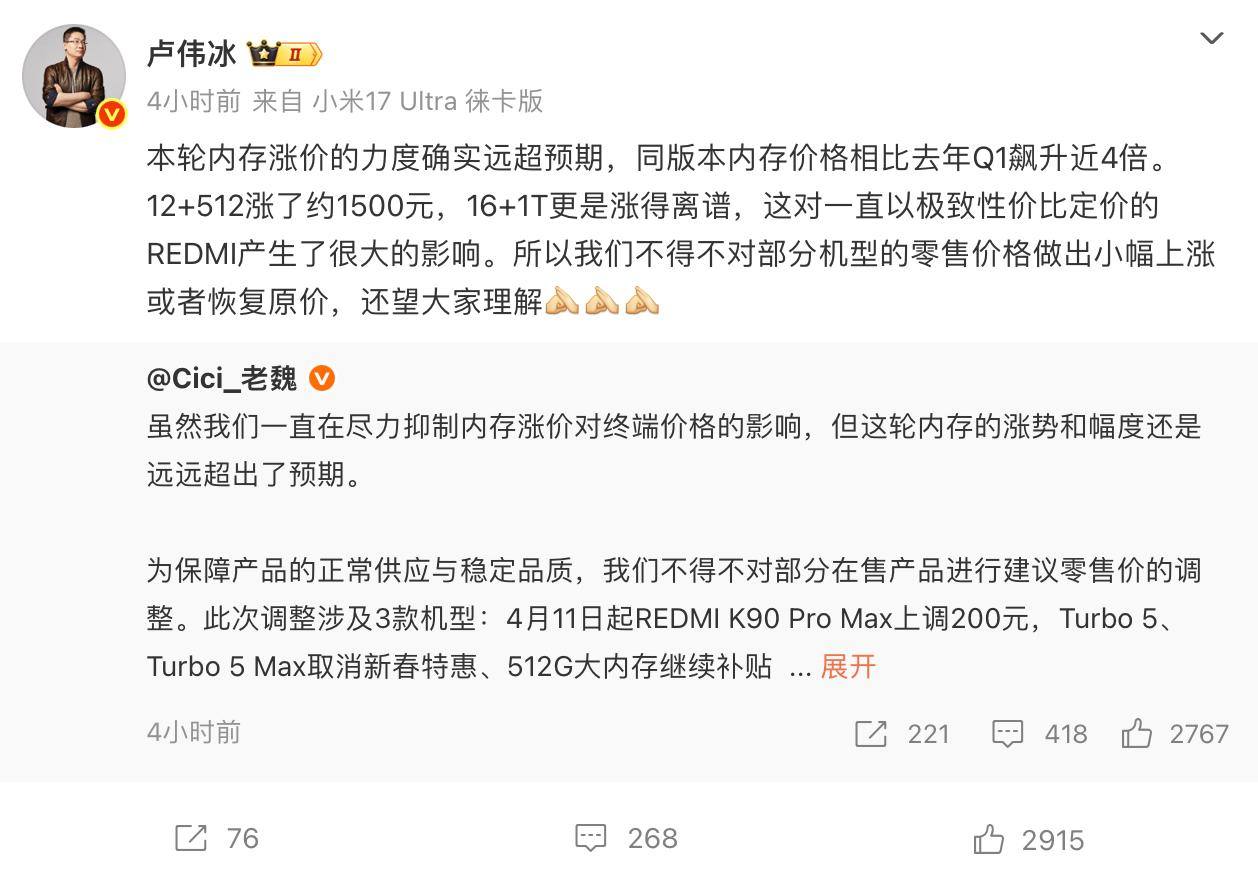 4月3日,卢伟冰宣布扛不动了,小米和REDMI部分机型涨价。