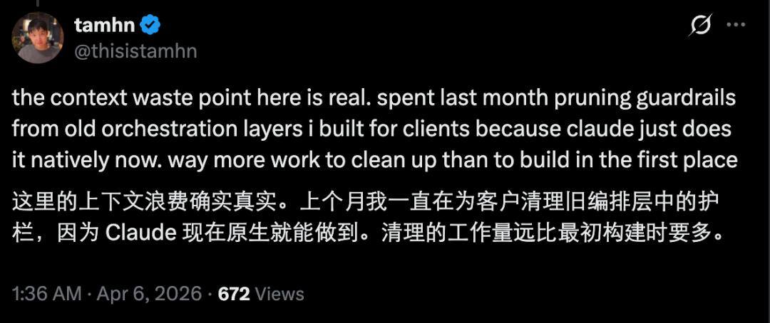 另一位开发者则用自身经历印证了这一点:他上个月花了大量时间清理为客户搭建的旧编排层里的冗余逻辑,「清理烂摊子,比当初搭的时候费力多了」。