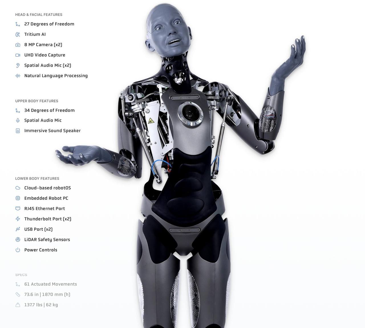 不同于传统机器人的僵硬面部表情,Ameca能够通过分布在面部的数十个高精度执行器,模拟出包括疑虑、惊讶、厌恶甚至微妙的幽默感在内的复杂表情。