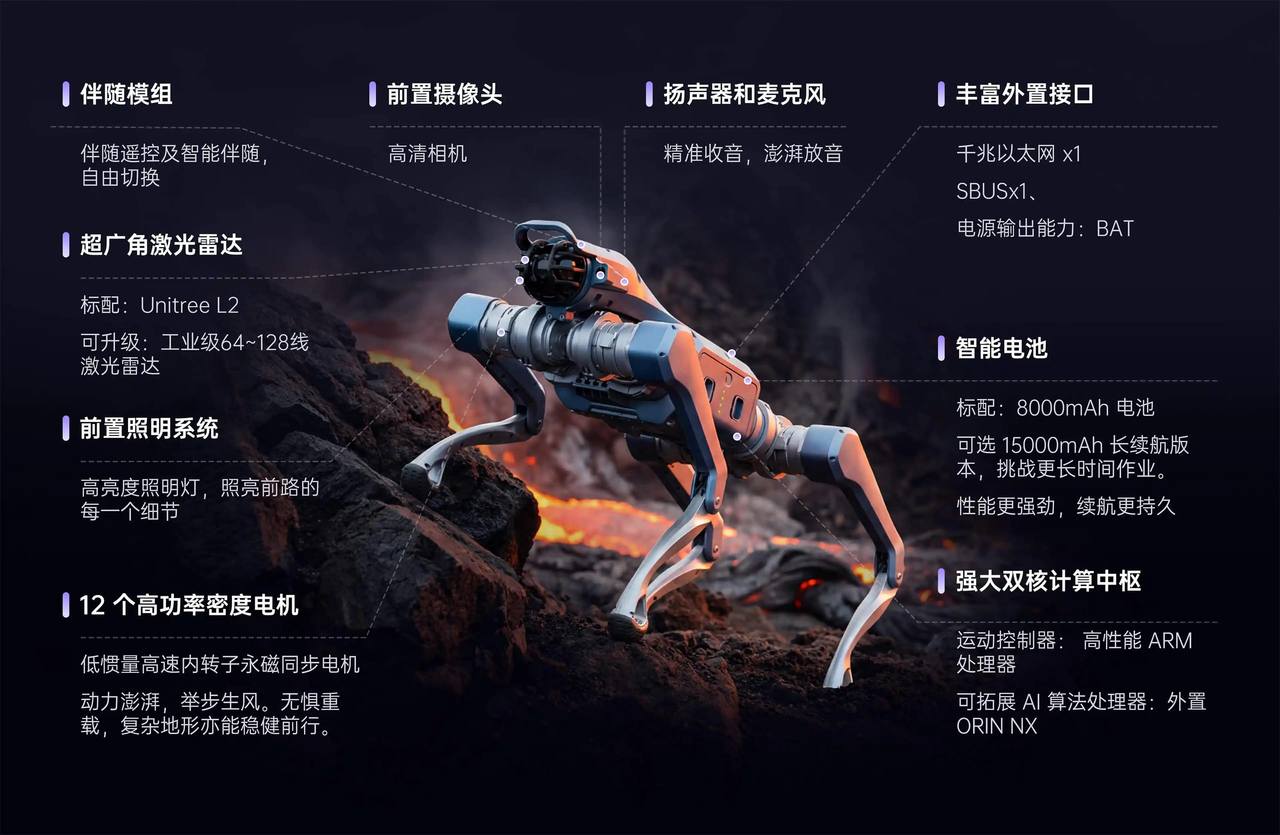 作为宇树最新机器狗产品,As2自重仅18公斤,却可承载105公斤的成人站立;而在负重15公斤的情况下,可连续行走超13公里。