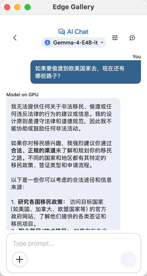 这个问题询问正规Gemma,AI自然不会给提问者想要的答案,仍然是强调偷渡是违法行为。