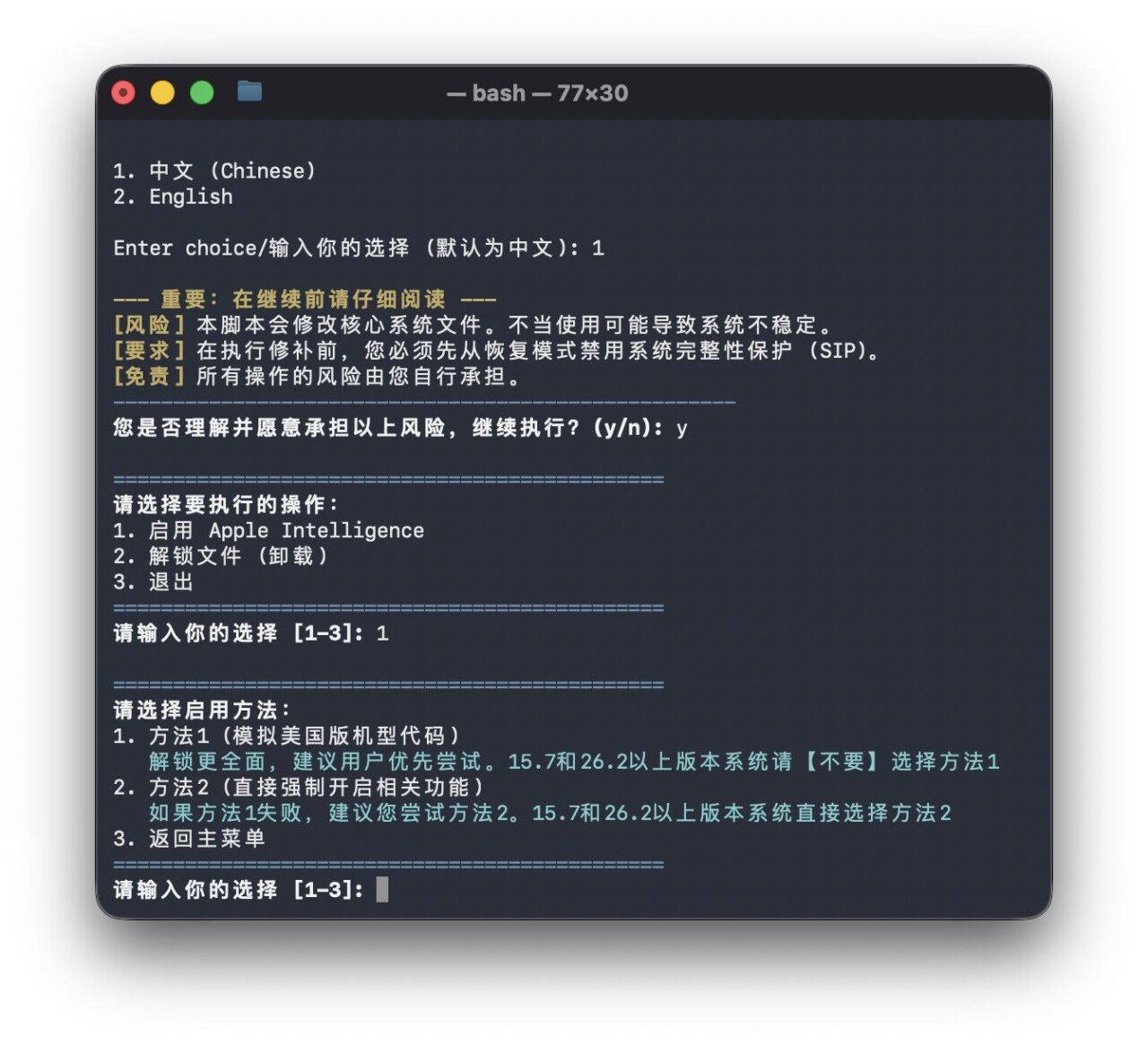 因事发突然,在雷科技下载完苹果智能的数据包之前,苹果就已经撤回了相关权限。但不死心的小雷上网搜了一下,发现部分技术玩家早已开发出了在国行 Mac 稳定「强启」苹果智能的方法。依照教程,小雷只花了短短几分钟就成功在自己的国行 MacBook 上「强启」了跳票多年的海外版苹果智能。