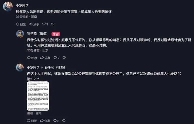 这对游戏玩家恐怕就不是什么好消息了。成年人的世界本就少有放松的时刻,游戏算是其中之一,如果让成年玩家的“游戏自由”消失,本质上是对公众利益的一次伤害。有趣的是,在4月7日公布判决的抖音视频下方,孙律师却并不承认自己曾经要求成年人防沉迷。